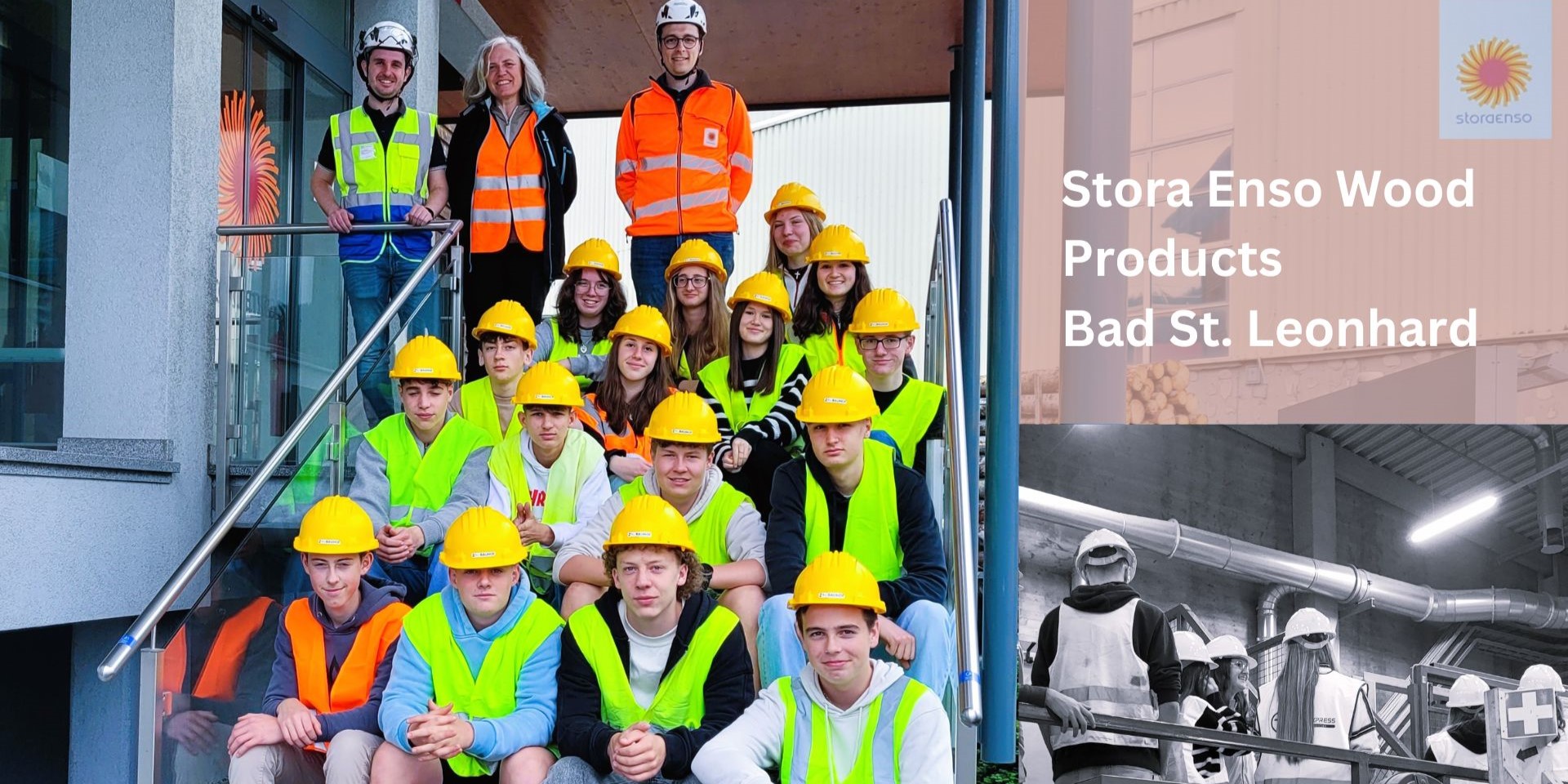 Die Holzbauklasse des 2. Jahrgangs durfte bei unserem Kuratoriumsmitglied Stora Enso Einblick in die Produktion von Brettsperrholz (CLT) erhalten. CLT besteht aus mehreren Einschichtplatten, die mit einem Strukturklebstoff in abwechselnden rechten Winkeln verbunden sind. Es eignet sich optimal für große Decken-, Dach- und Wandelemente und sorgt dabei für erheblich reduzierte CO2-Emissionen im Vergleich zu Beton und Stahl.