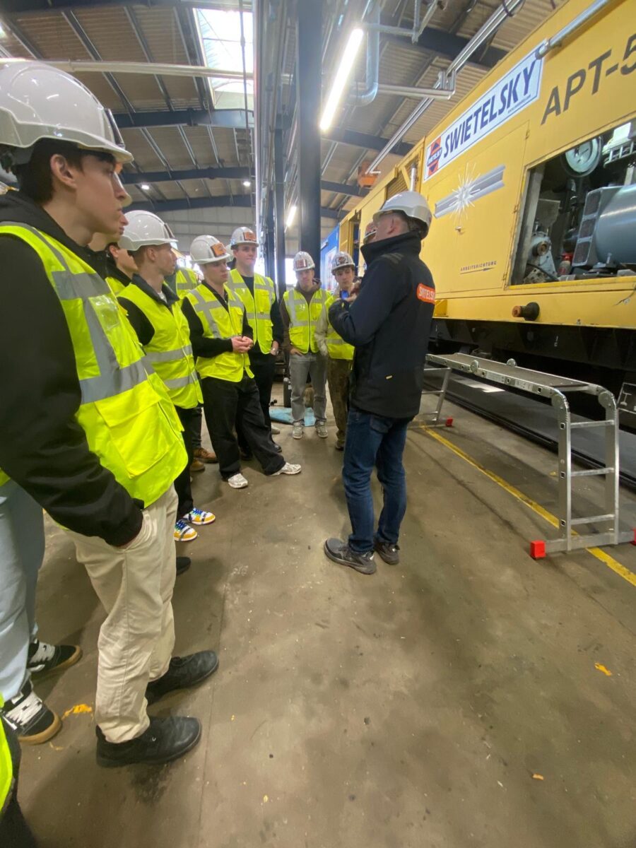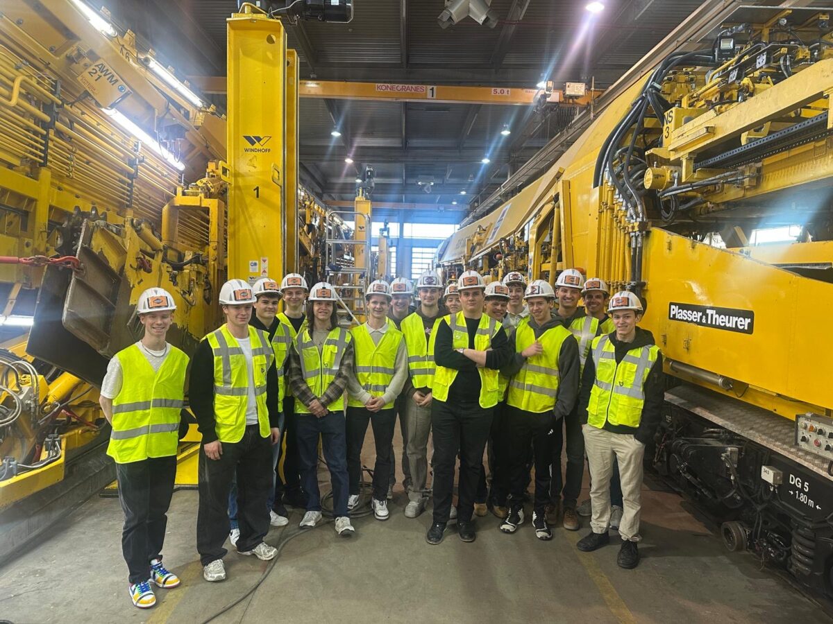 Der erste Programmpunkt führte uns zur Firma Swietelsky. Dort erhielten wir detaillierte Einblicke in die Fertigung sowie in verschiedene Prüfverfahren, die zur Qualitätssicherung im Gleisbau eingesetzt werden. Besonders beeindruckend war die mehrere hundert Meter lange Maschine zur Revision der Gleise und des Unterbaus. Diese hochkomplexe Anlage zeigt eindrucksvoll, wie moderne Technik eingesetzt wird, um Infrastruktur effizient zu warten und nachhaltig zu erneuern. Für die Schülerinnen und Schüler war es besonders spannend, theoretisches Wissen aus dem Unterricht in einem realen industriellen Umfeld wiederzufinden.