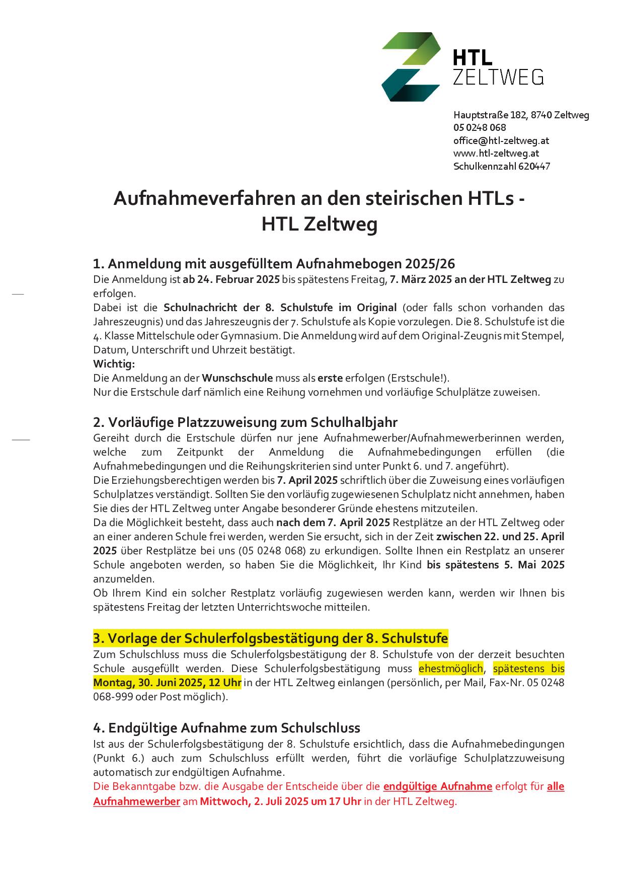 Unten stehend finden Sie die für die Aufnahme erforderlichen Formulare, das Informationsschreiben betreffend die Aufnahme von Schülerinnen und Schülern für das Schuljahr 2025/2026 sowie eine Aufstellung, wann eine Aufnahmsprüfung zu machen ist.